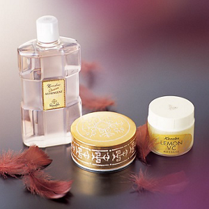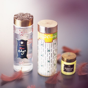 Newer models of the product containers featuring textile patterns reflect Kanebo’s core business in the early years.