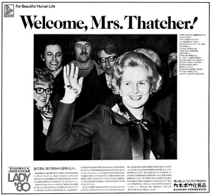 Coinciding with British Prime Minister Margaret Thatcher’s visit to Japan, Kanebo published this advertisement in a national newspaper to encourage women to explore life beyond traditional roles and achieve social success (Evening edition of The Asahi Shimbun, June 27, 1979)