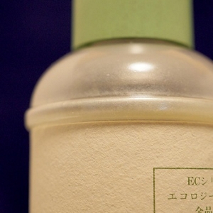 Kanebo EC chose a packaging design with the best technologies available at the time. The container caps were a composite mixture of resin and rice husk, while the bottles used a specialized type of PET (polyethylene terephthalate), five times thinner than conventional PET bottles. Durable paper tubes made with recycled paper protected the thin bottles and removing box packaging cut down on excess waste.